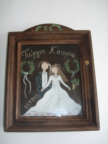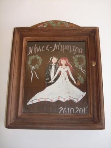 Hand-painted wooden wreath box, decapated brown with “Bride & Groom” theme.